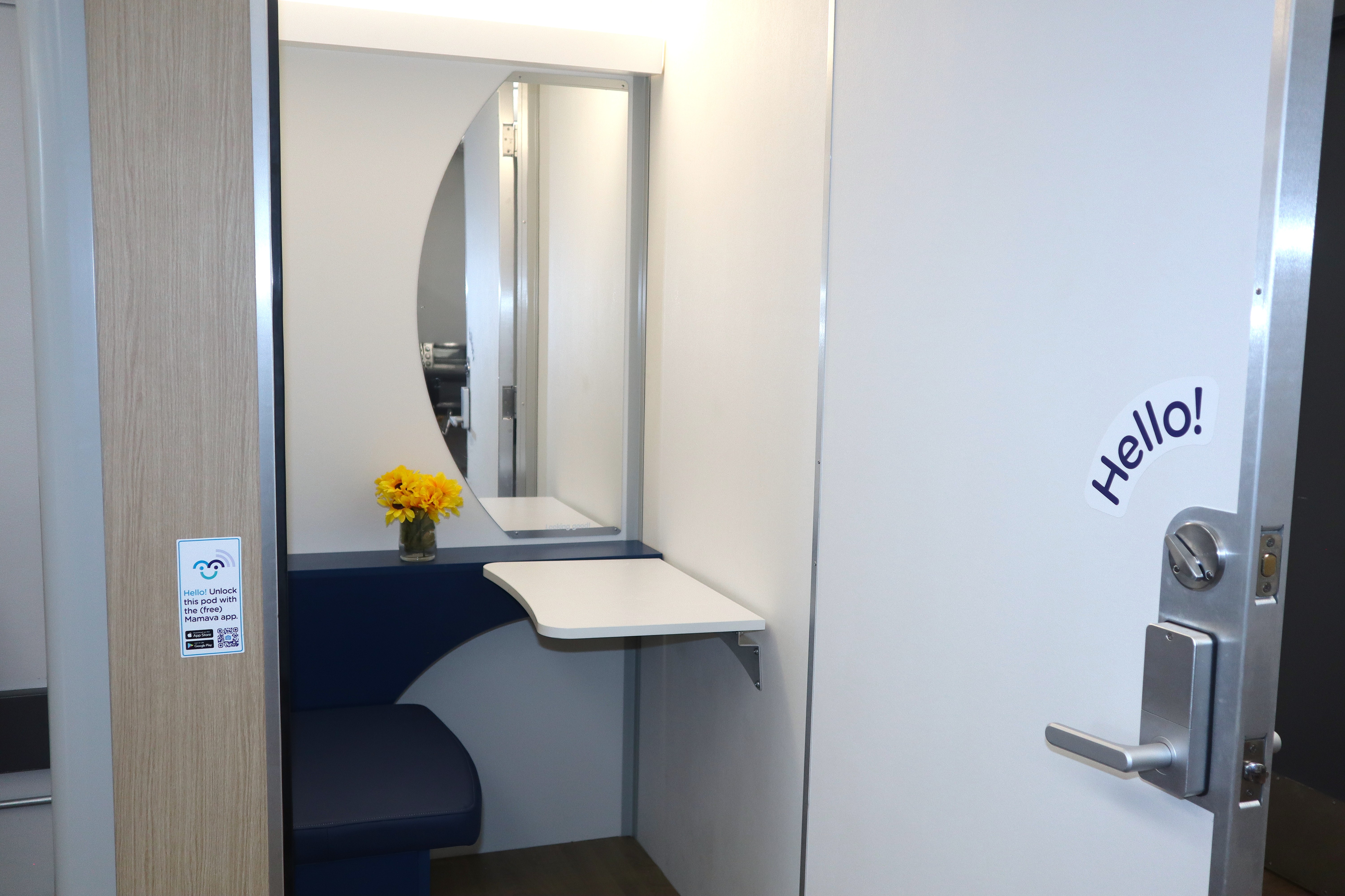 Each pod comes with built-in seating, a fan and white noise system, lighting, shelves, a mirror, coat and bag hooks, and charging outlets. Parents access the pods with the Mamava app so there is no need to track down a key and they can easily check if the space is occupied.